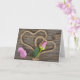 Pair of rope hearts with pink rosebud and loose petals on rustic barn wood for newlywed congratulations.