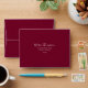 A simple minimalist wedding RSVP return envelope template. This design features a simple minimalist details template, wedding rsvp return simple burgundy,a2 note card watercolor floral, rose blush wine marsala flowers, elegant matching simple nature botanical, fall winter spring summer, autumn rsvp return envelope, simple modern minimal template, simple elegant calligraphy script, watercolor floral foliage chic, autumn champagne boho garden