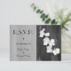 A wedding RSVP card featuring a black and white image of white orchids over barnwood.