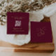 Burgundy and chartreuse wedding RSVP card with a QR code and a monogram locket illustration on the back.