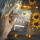 Wedding RSVP Reply Card Templates - Vintage Lace, Sunflower and String Lights on Rustic Wood Background.