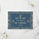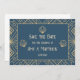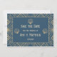 Art Deco style wedding save the date card with navy blue background and gold geometric motifs