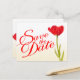 Beautiful single bright red tulip on cream rustic colour save the date wedding informal invitation. Customise this invitation with your own words. Simple modern and romantic invite, ideal for a spring or tulip flower wedding. Design and fine art watercolor tulip painting by Sarah Trett.