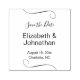 This is a wedding save the date stamp. The top line of the text says Save the Date in an elegant script. There are lines of non-script text for the names of the bride and groom, the wedding date, and the wedding location. All text can be edited or deleted.
