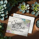 Save The Date Wedding Invitation Postcard Templates - Elegant lovely Watercolor Succulent Plants on White Rustic Wood Background.