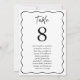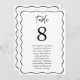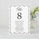 Make a sophisticated statement with this double-sided wedding table number and guest list card, featuring a graceful black wavy frame border on both sides for a polished, cohesive look. Designed in timeless black on crisp white, this 5" x 7" template showcases a bold serif table number, italicised guest names, and the word "Table" in a chic handwritten script font. Both sides of the card are identical, allowing for easy viewing from any angle—perfect for weddings, anniversaries, or engagement parties. Personalise with your guest names and details, or request a custom colour to match your theme. Part of our coordinating black and white wedding collection with handwritten-style script, this minimalist table card adds a refined and modern touch to your celebration decor!