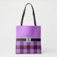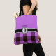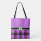 Trendy, elegant and modern customisable bag features "personalised name" on Orchid background at the top, "personalised monogram" on black stripe beneath and Orchid / black plaid tartan background at the bottom.