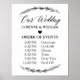 Wedding schedule sign with laurel decorative pattern.