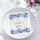 A faux silver looking background decorated with faux glitter, sparkles and blue flowers. Personalise and your names and the wedding date.