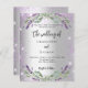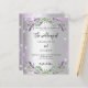 A modern, stylish wedding invitation. A faux silver looking background with violet faux glitter, sparkles, lavender florals, flowers and eucalyptus greenery. Personalise and add your names and the details.