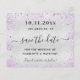 A trendy wedding Save the Date. A faux silver background. Decorated with purple, lavender coloured faux glitter sparkles. Personalise and add a date, place and your names. Save the Date is written with a modern hand lettered style script with swashes.