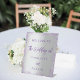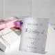 A faux silver looking background, decorated with purple faux sparkles. With the text: Welcome to The Wedding of. Personalise and add your names. Purple text.