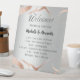 A wedding timeline, program. A stylish faux silver looking background decorated with rose gold marble veins. Personalise and add your names and the program. Black letters.