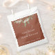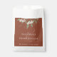 This design features a terracotta wedding candy favour paper bag template with elegant floral greenery, a stylish trendy calligraphy script, with classic simple minimalist ampersand typography lettering, wedding bride and groom names, a simple white flower leaves foliage, a wedding party reception treat favour, a wedding guest cookies bars desserts, a simplistic elegance rust earth tones, a minimalist minimal classic traditional, a creative stylish wedding décor.