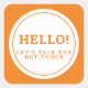 Social distance wedding amber hello sticker. Help your guests feel safe and let other guests know you need them to keep a distance away to protect yourself or you more vulnerable guests. Code amber-orange wedding sticker reads Hello! Let's talk but not touch. Ideal to add to a guest virus safety wedding kit or event kit. Matching posters and instructions are also available. Designed by www.mylittleedenweddings.com