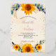 A white and golden watercolored background decorated with sunflowers, eucalyptus greenery and golden leaves and faux gold glitter dust. Personalise and add your names and party details. Black and rose gold text. The rose gold is written with real foil.