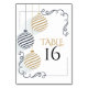 Wedding Table Number Card | Modern Black and Gold Minimal Holiday Baubles - Original design by ©WhimsicalArtwork™ - Three black and gold striped Christmas ornaments hang at varying levels - paired with gold corner scrolling and a contemporary font make this a nice addition to a very unique avant-garde wedding invitation suite - customise with your information easily - this is part of the Modern Black and Gold Minimal Holiday Baubles Collection A combination of script calligraphy combined with a minimalist, contemporary style text layout makes it a trending style wedding suite. This is part of a wedding stationery collection with matching wedding accessories by the BarefootBride™.