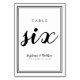 This design was created for smaller intimate wedding celebrations. Simple, minimalist and elegant Wedding Table Number SIX design features a contemporary design with a double frame border in black on a crisp white background. The chic design provides timeless yet modern sophistication. Personalise wedding table design with your wedding details in sophisticated black lettering and script. The back of the card is a duplicate of the front. Order one for every table with the individual table numbers.