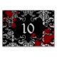 Gothic Halloween wedding reception table place card with a grey damask pattern on black on both sides and blood splatters. Add the correct table seating number on it easily. The blood splats are removable.