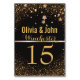 Starry black and gold glitter wedding table number cards for your custom wedding decor. Charcoal matte black background with faux gold foil glitter at the top and bottom edges with silver and gold stars scattered across the top. A gold metallic look strip separates the gold colour personalised bride and groom names and last name in elegant script from a jumbo gold hue table number. Identical on other side. Customise individually and add each wedding table number card separately to your Zazzle shopping cart. Perfect for elegant black and gold glitter weddings, as well as Great Gatsby inspired Art Deco wedding themes. Suitable for other special occasions, such as engagement parties, bridal or wedding showers, etc.