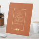 Create an elegant wedding pedestal sign. Great wedding tabletop sign for couples looking for terracotta party supplies and are using terracotta as their wedding colour. Customise the text on the front. Terracotta and gold colours. Use the template to create your own custom wedding sign.