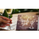 Wedding Thank You Card Templates - Elegant Lettering Script, Vintage Champagne Glasses and String Lights on Rustic Wood Background.