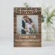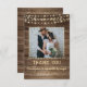 Your wedding photo is accented with a rustic, country, brown weathered wood plank background and soft yellow glow string lights along with the editable title of THANK YOU and your wedding date in a country western hand-printed font and your names in a rough brush script font. The back of the card features the same wood plank background and offers a place to type a general thank-you message (or delete the sample text to leave blank for personal handwritten notes of appreciation). PHOTO TIP: For fastest/best results, choose a photo with the subject in the middle and/or pre-crop it to a square shape BEFORE uploading. Contact the designer via Zazzle Chat or makeitaboutyoustore@gmail.com if you'd like any customisation or want coordinating items.