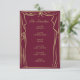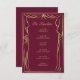 Burgundy and chartreuse coloured wedding timeline design with a hand drawn illustration of a curtain and vintage inspired typography.