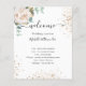 White elegant background, decorated with a white watercolored floral, eucalyptus greenery, golden foliage and faux gold glitter dust. Personalise and add your names and your wedding day timeline.