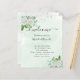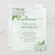 A watercolored green background, decorated with white florals, eucalyptus greenery, and faux silver glitter dust. Personalise and add your names and your wedding day timeline.