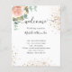 White elegant background, decorated with a rose gold and blush pink watercolored floral, eucalyptus greenery, golden foliage and faux gold glitter dust. Personalise and add your names and your wedding day timeline.