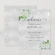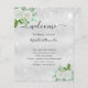 A faux silver metallic looking background, decorated with a white watercolored white florals, eucalyptus greenery, and faux silver glitter dust. Personalise and add your names and your wedding day timeline.