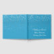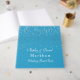 This guest book is shown in Turquoise Blue with a curtain of silver coloured petite stars on both front and back are splattered all over this guest book. Front has text reading your two personalised names in a fancy script, your last name in bold text style.