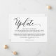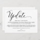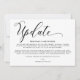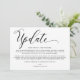 Modern simple wedding update announcement card. Design features calligraphy script ''update'' and details in trendy capital lettering.