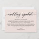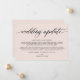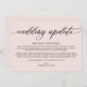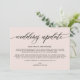 Modern simple wedding update announcement card. Design features calligraphy script ''wedding update'' and details in trendy capital lettering.