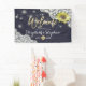 Wedding Welcome Banner Templates - Elegant Sunflowers, Vintage Lace Frame and Chic String Lights on Navy Blue Background.