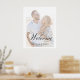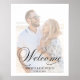 This design features a wedding welcome sign, black and white, reception, simple, an elegant, photo, an engagement photo, photography, calligraphy script, rehearsal dinner welcome sign