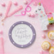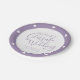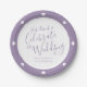 Simple graphic muted purple script calligraphy text and white hearts wedding paper plates. Typographical text reads Eat, drink & celebrate the wedding of then add your own names underneath. A great personalised addition to your wedding buffet or party tables. Other matching items and colours available in this design. © Original design by Sarah Trett www.sarahtrett.com for www.mylittleedenweddings.com
