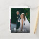 A modern wedding thank you postcard with your photo overlayed with "thank you" in a white script with swashes and your names and wedding date in simple white typography. On the reverse side, add an additional photo, personalise a thank you message and add your names in a signature-like script.