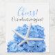 Custom wedding wine bottle labels with starfish and blue hydrangea design. “Cheers” in blue with one more line of text beneath. Sample wording is, “Our adventure begins”. The design will transfer to some of the other label sizes. See more in the Seaside Garden Blue design line in our store.