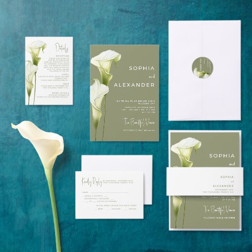This wedding Wine Label features a sophisticated, minimalist style. Delicate calla lilies in soft green hues are depicted against a light background, creating an atmosphere of sophistication and tranquility. The design is modern, airy, and perfect for a stylish, romantic wedding.