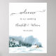 Welcome to an elegant winter wedding. Personalize and add the names of the bride and groom and a date. White background, winter forest a small house almost covered in snow. Black text. Welcome is written with heart swashes. Wedding is a celebration of love, lasting forever in the hearts of those who witnessed it.