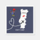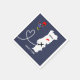 A fun personalised napkin for couples getting married in Portugal with a white silhouette map of portugal on blue with red love hearts and a lucky Portuguese Barcelos Rooster; so easy to customise with your personal names or message.