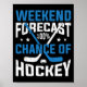 Hockey player poster with a humourous saying features white and blue text on a black background that reads Weekend Forecast 100% Chance of Hockey!