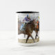 Winter racing at historic Aqueduct Racetrack, home of the prestigious Wood Memorial stakes. Jockey Rajiv Maragh and Junior Alvarez battle head to head for the lead. Colourful closeup of two thoroughbreds being urged for the win.
