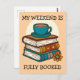 Whimsical postcard design for book lovers and bookworms. An illustration of a cosy pile of books with a coffee cup balanced on the top. The colours are blues, reds and oranges. Above and below the image are the words 'My Weekend Is Fully booked' in black text. These are templates for you to add your own words if you wish to change them.