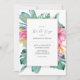 Weekend getaway invitations feature tropical flowers and palm leaves in shades of pink, orange and green. Use the template fields to add your custom details. Order printed cards online or printable invitations. An elegant choice for a girl's birthday weekend or bachelorette weekend with a tropical beach themes. To see more designs like this visit www.zazzle.com/dotellabelle