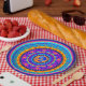 Hand painted artwork inspired by otomi embroidery style decorative patterns. Depicts weimaraner in center of circles and floral patterns along with rabbits running around the outer circles of muli-colored layers of bright hues on a dark blue background.