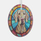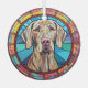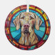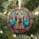 This is a pretty glass ornament with a stained glass theme, featuring a beautiful grey Weimaraner dog. The dog is set against a predominantly blue background with a gold and orange border. This makes a nice stocking stuffer or decoration for the household who loves a Weimaraner.