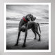 Black and white photograph with color on dog collar only, of a Weimaraner dog on the beach standing, looking backward.